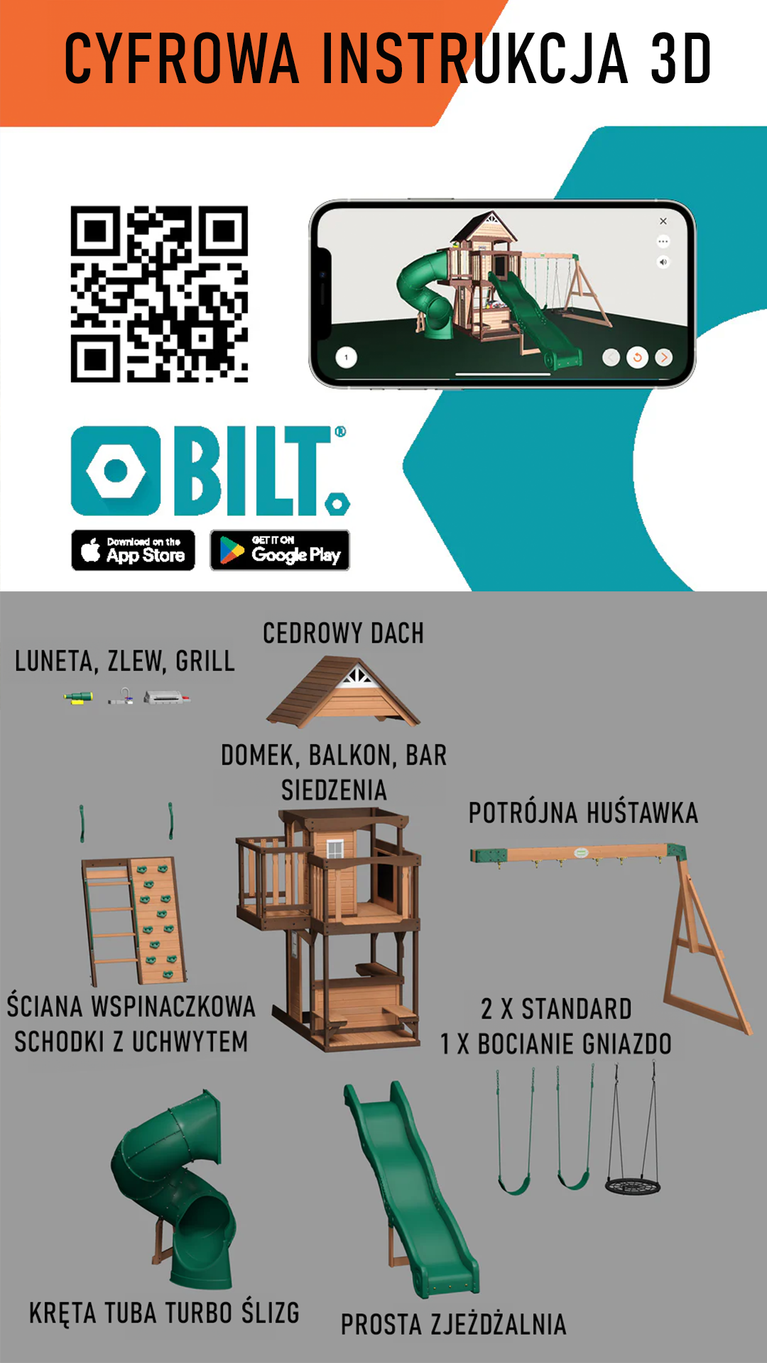 Każdy zestaw możesz złożyć samodzielnie dzięki prostej instrukcji lub skorzystać z profesjonalnego montażu naszego zespołu. Dbamy o to, by Twoja przestrzeń do zabawy była gotowa bez stresu i na czas!